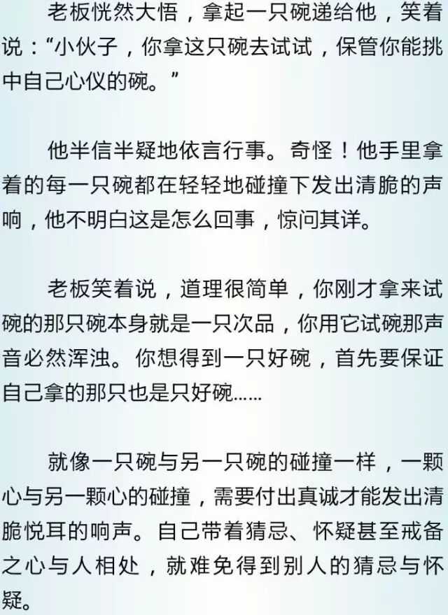 他得意地告诉老板,这是一位长者告诉他的挑碗的诀窍,当一只碗与另一只碗轻轻碰撞时,发出清脆、悦耳声响的,一定是只好碗。