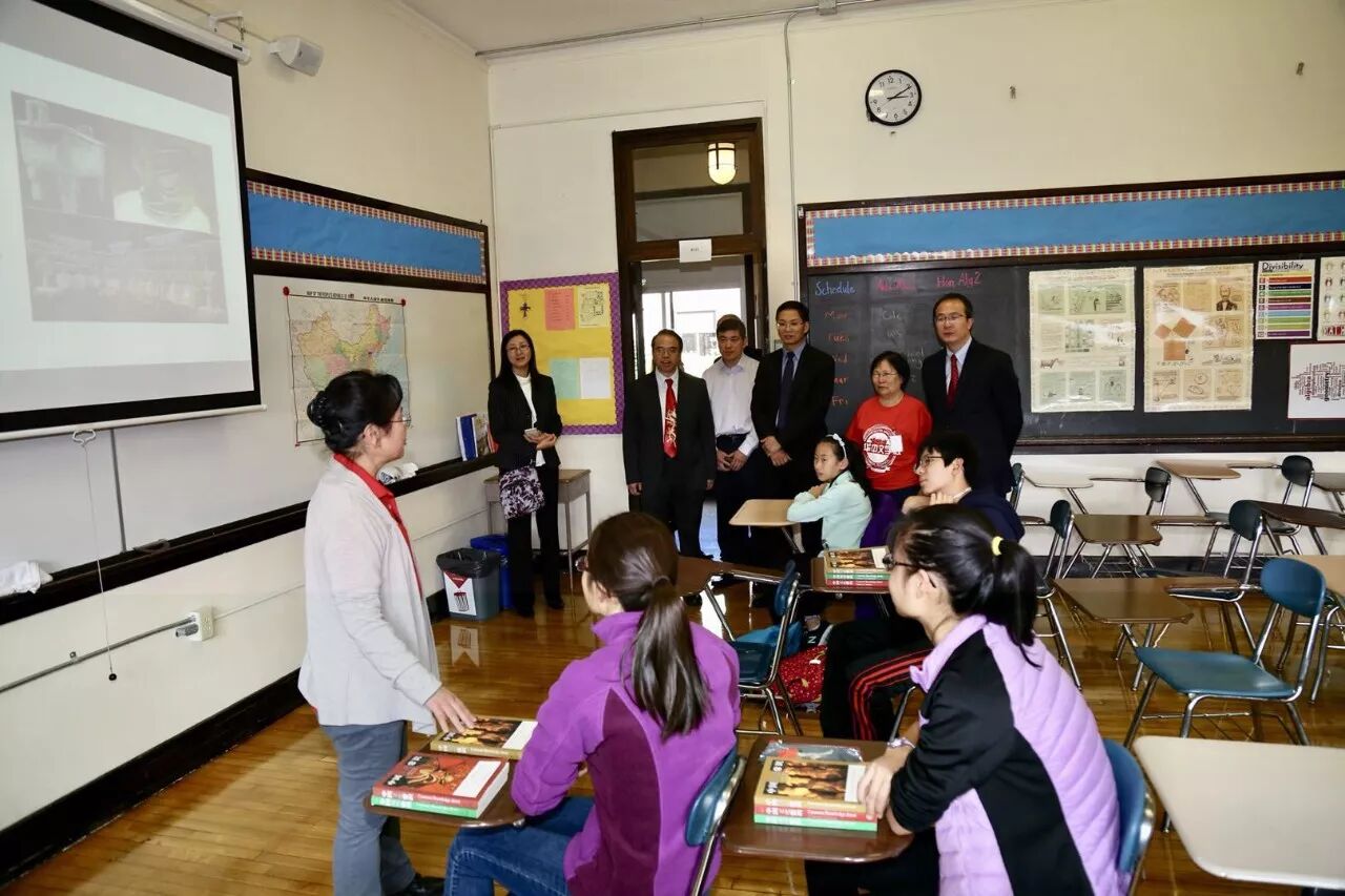 中国驻芝加哥总领馆洪磊总领事、余鹏副总领事、柳青领事和王芸领事一起观看了在明华中文学校举行的系列活动,并观摩了中文学校优秀教师的课堂教学。他们在明尼阿波利斯亚洲艺术馆馆长柳杨的陪同下兴致勃勃地参观了艺术馆。