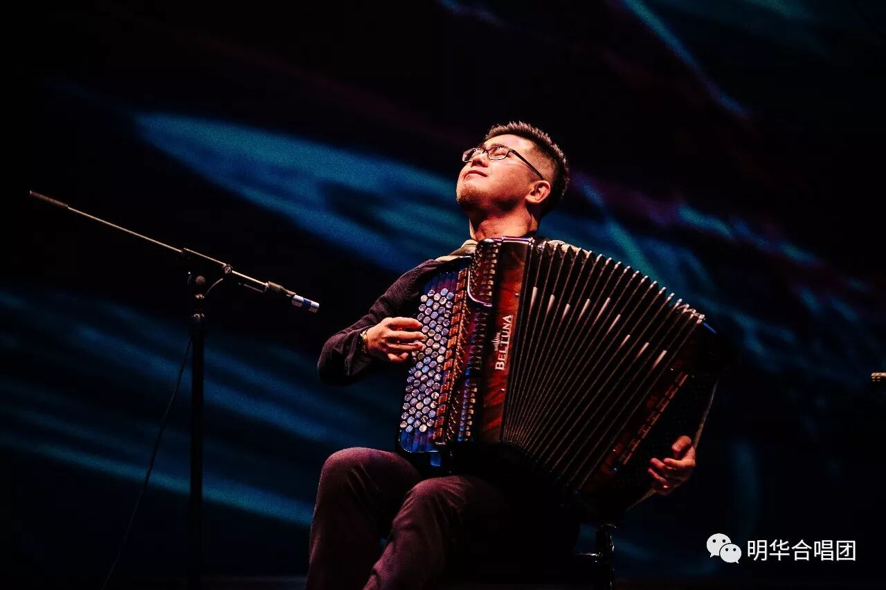 之后,明华合唱团女生表演了合唱《贝加尔湖畔》,歌声尚未开始,特邀手风琴表演家刘昭便以以如泣如诉的琴声,立刻抓住了观众的心。钢琴伴奏庞清托与刘昭手风琴和女声演唱完美地融为一体,带着观众走进了如梦的贝加尔湖畔。