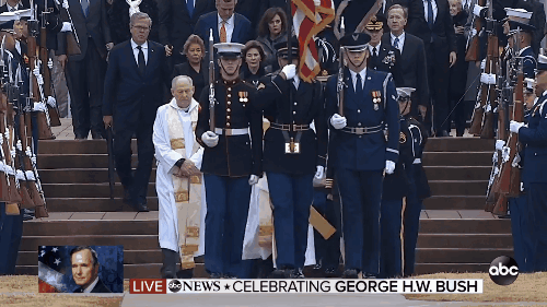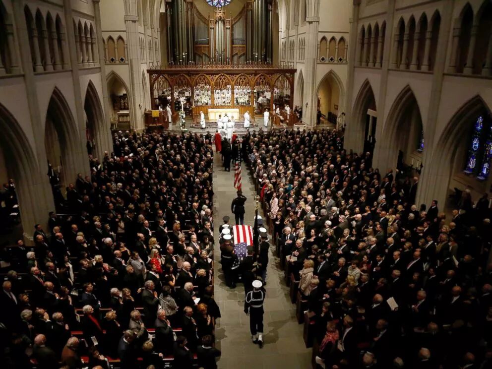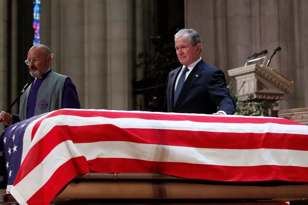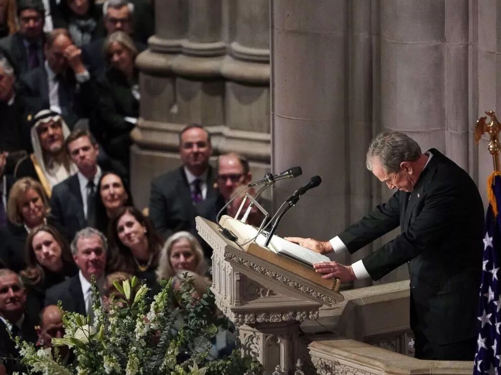 现任总统川普、前总统卡特、奥巴马、德国总理默克尔、英国皇室代表查尔斯王子等政要出席了葬礼。小布什为父亲朗读了悼词,最后一度泣不成声。