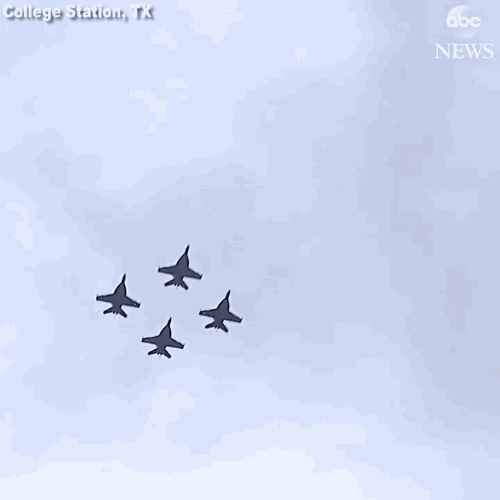 校园内,仪仗队和TAMU的师生在等着他,海军的战斗机从上空飞过。