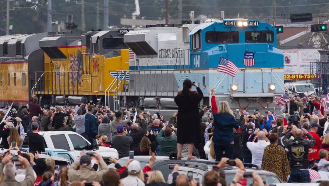 一路上,围在铁道周围等待火车经过的人群,再一次体现了德州人对老布什的喜爱。