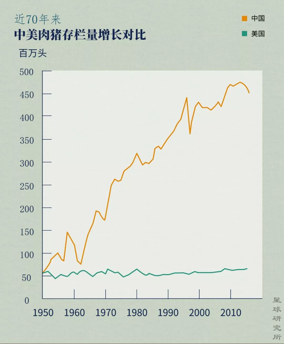 (近70年来中美肉猪存栏量增长对比,制图@郑伯容/星球研究所)