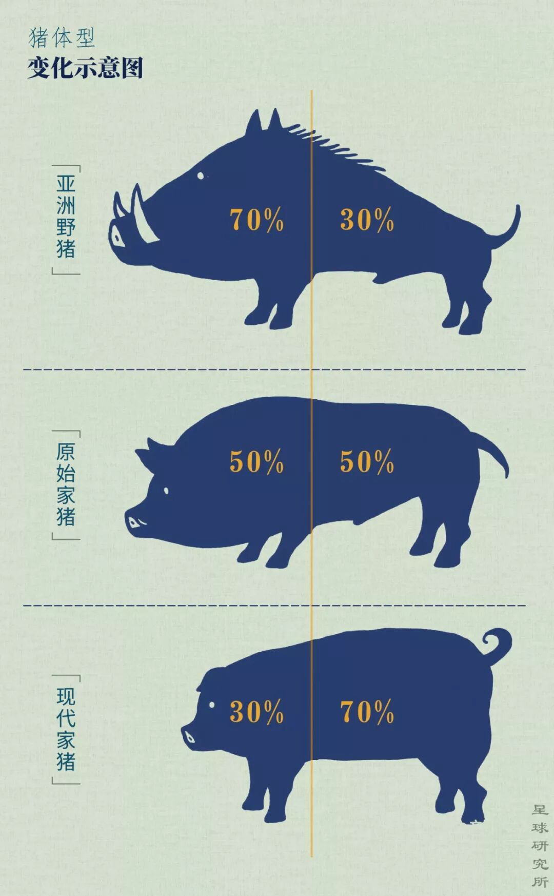 (猪体型变化示意图,制图@郑伯容/星球研究所,依据钱燕文《饲养动物的起源》)