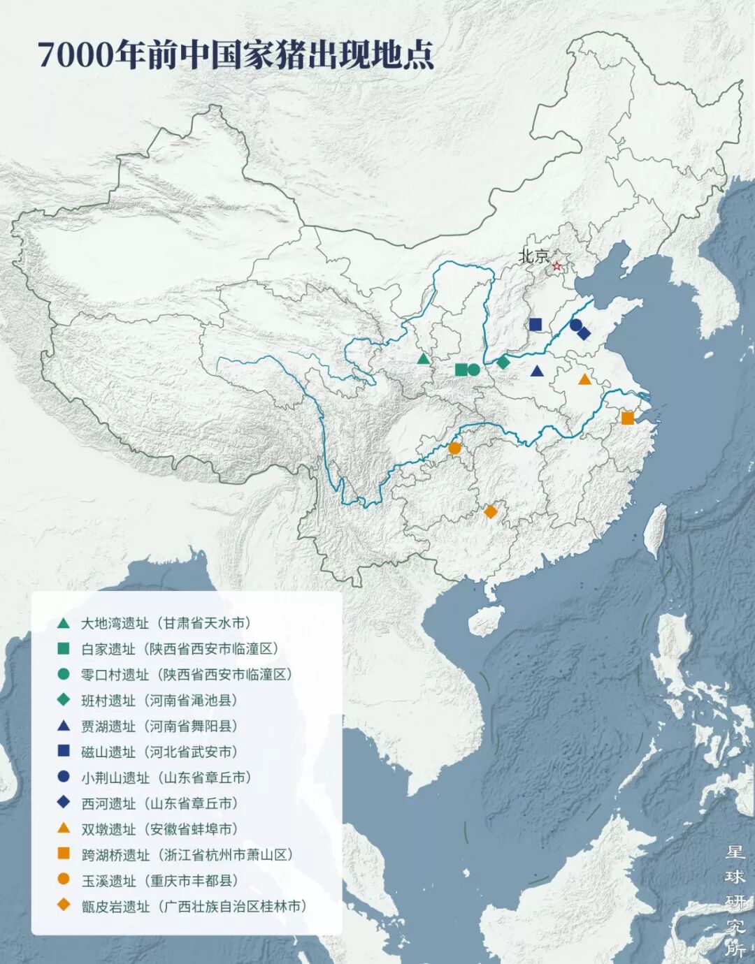 (7000年前中国家猪出现地点,制图@郑伯容/星球研究所,依据罗运兵《中国古代猪类驯化、饲养与仪式性使用》)