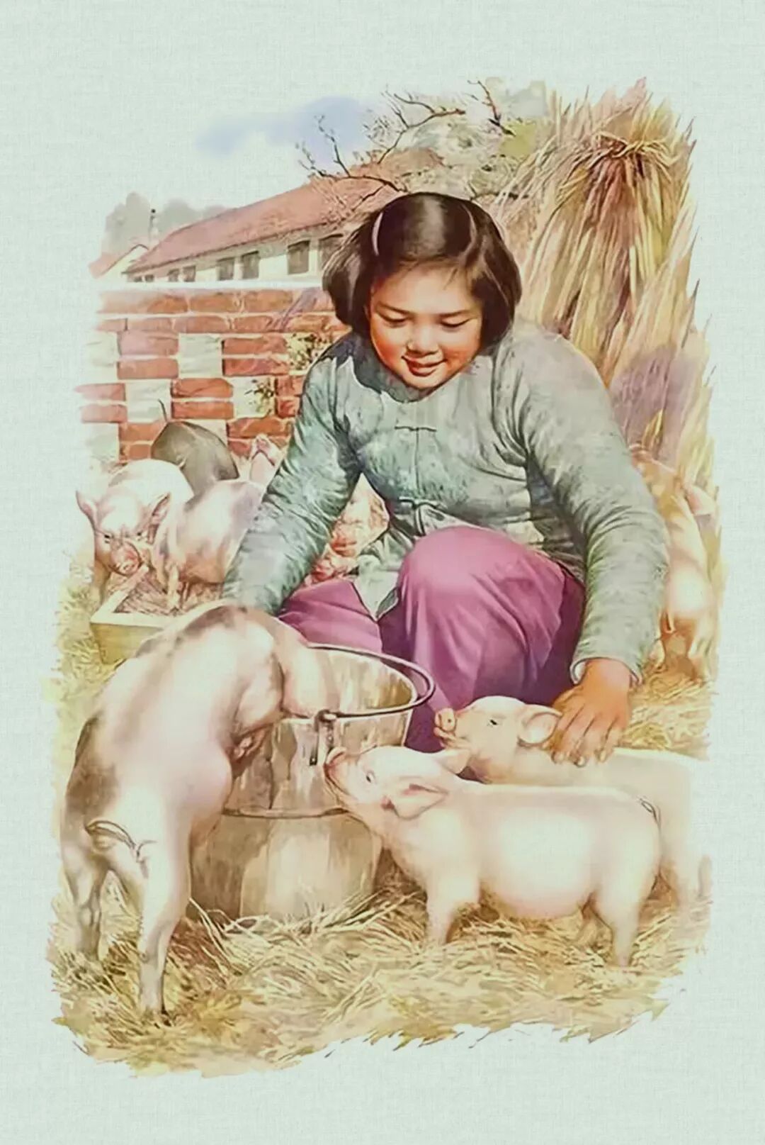 (1960年的养猪宣传画《优秀的女饲养员》,作者金梅生)