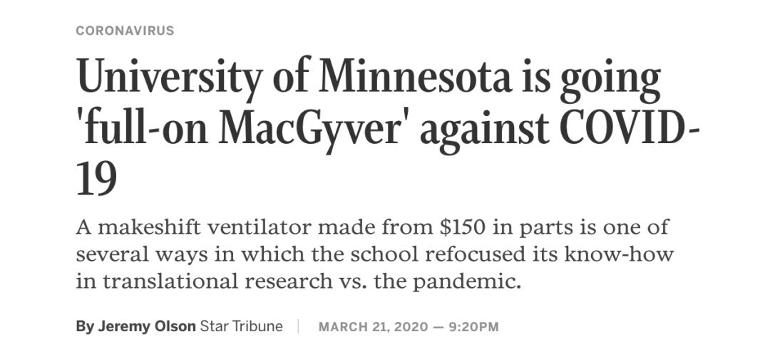 在疫情期间,明尼苏达大学发挥其转化研究方面的专长,用价值仅150美元的零部件制作的呼吸机模型便是研究项目之一。