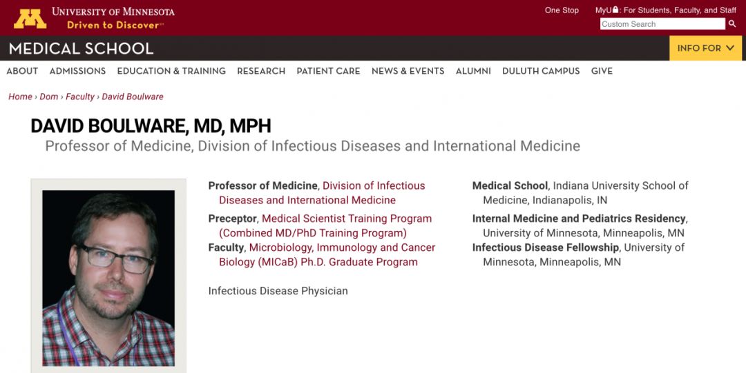 目前有多项研究正在探究这款药物用于治疗新冠肺炎的可行性,大卫·布维尔博士(David Boulware)决定征集1500名具有极高感染新冠病毒风险的人参与研究,以检测这款疟疾药物是否可以延缓病症。