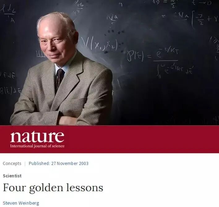 《Four golden lessons》,是美国物理学家、诺贝尔奖(1979)获得者Steven Weinberg发表在Nature-scientist 上的一篇文章,文章中,温伯格为即将进入科研领域的研究生总结了四条箴言。