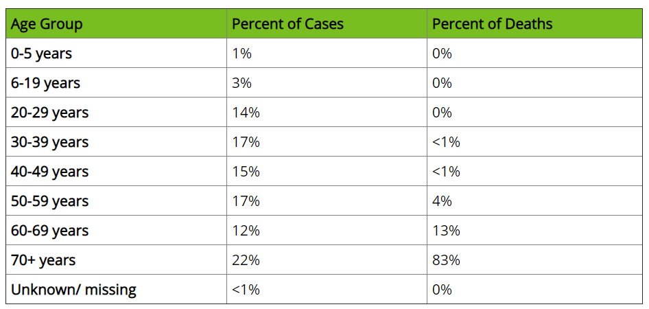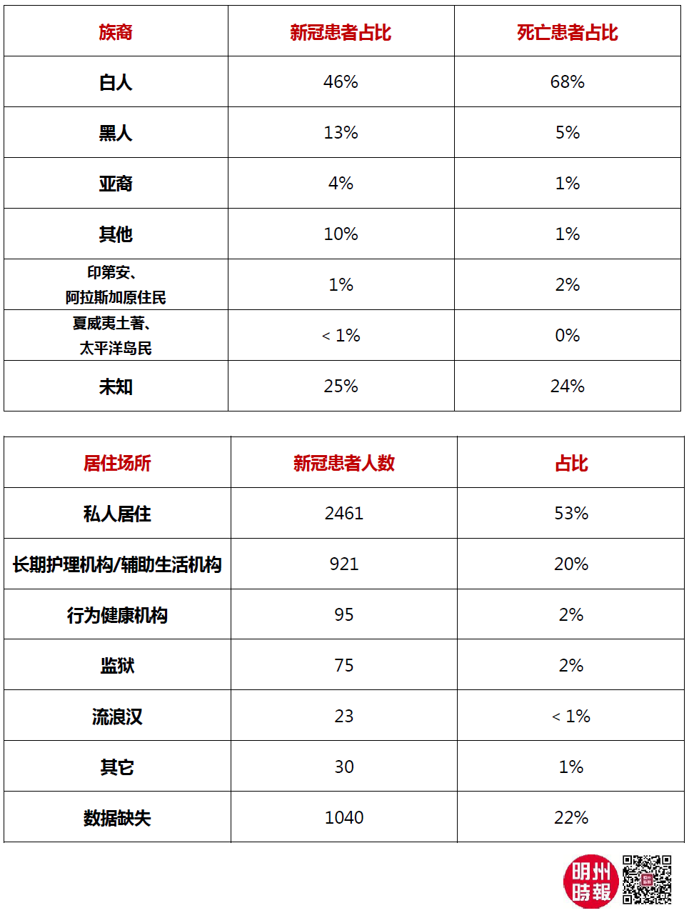 4月29日,明尼苏达卫生署公布最新统计:在明州的新冠死亡患者中,近80%的人是长期护理机构的居民,99%的人存在潜在的健康状况(包括最新公布的年仅30岁的死亡患者)。此外,明州卫生署官网自周一开始,公布各年龄阶段的患病占比和死亡占比。
