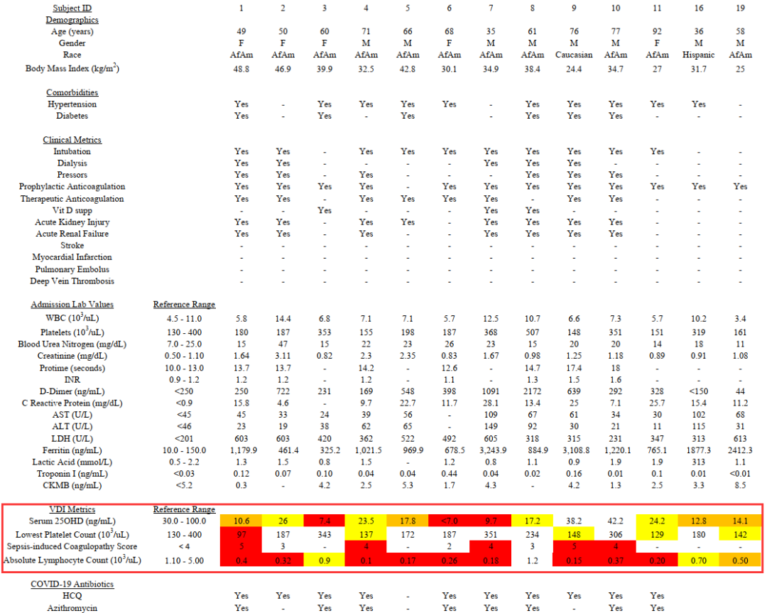 随后研究人员对这13名ICU病人进行了检测分析,发现其中11名(84.6%)存在VDI,而且低于75岁(11人)的ICU病人都存在VDI(25OHD < 30 ng/mL),有7人的25OHD值极低;对其中8人进行脓毒症诱导的凝血病评分(SIC),5人SIC ≥ 4(参考值 < 4);并且普遍存在免疫功能低下:12人淋巴细胞减少,9人更为严重-淋巴细胞绝对数≤0.4×103/uL(参考值1.10-5.00×103/uL)。
