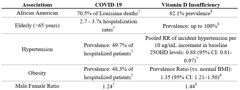 基于以上结果,研究人员对VDI与COVID-19之间的关联性进行了讨论,比如VDI普遍存在于黑皮肤人种(非裔美国人82.1%,整体41.6%),这可能是路易斯安那州COVID-19死亡病例中非裔美国人所占比例较高的原因;欧洲地区的意大利,西班牙和希腊的COVID-19严重程度要高于斯堪的纳维亚半岛的国家,可能因为前者(70-90%)的VDI率要高于挪威和丹麦(15-30%)。相比而言,斯堪的纳维亚人的饮食中含有更多的维生素D(多为高脂肪的鱼和可补充维生素D的乳制品)。