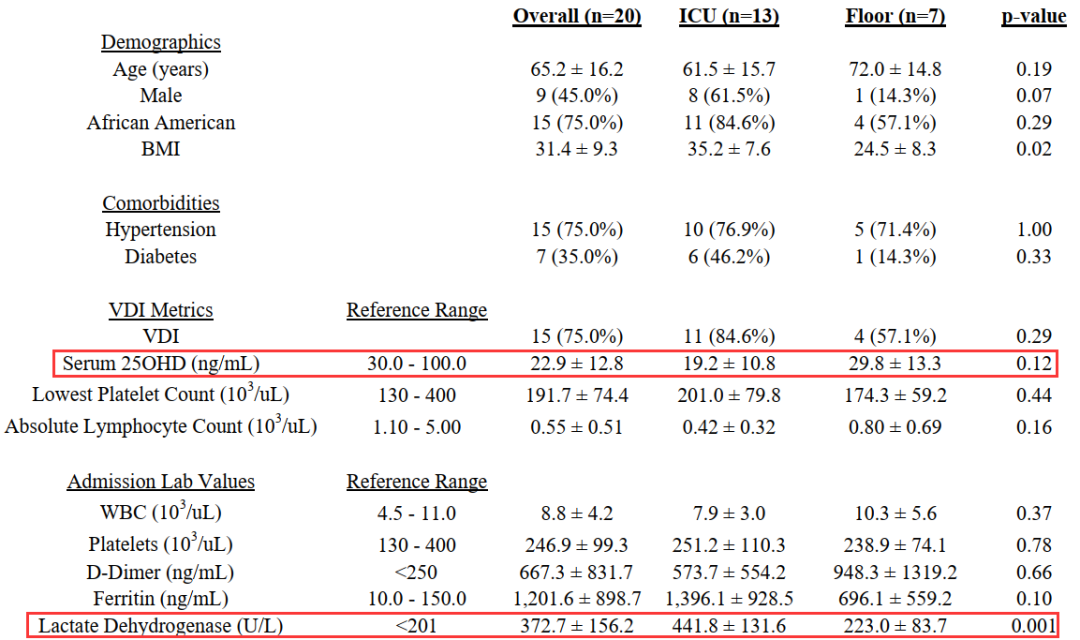 研究人员测定了20名COVID-19病人血清的25OHD(维生素D在体内的主要形式)。其中13人需要ICU监护,另外7人来自住院楼,发现二者的25OHD水平并没有显著性差异(作者认为可能受限于病人数量)。与之前报道一致的是,ICU病人的乳酸脱氢酶水平明显偏高。