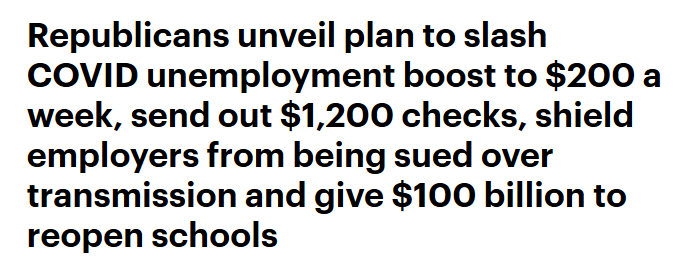 联邦每周额外补贴的600美元失业救济金将减少为每周200美元; -
