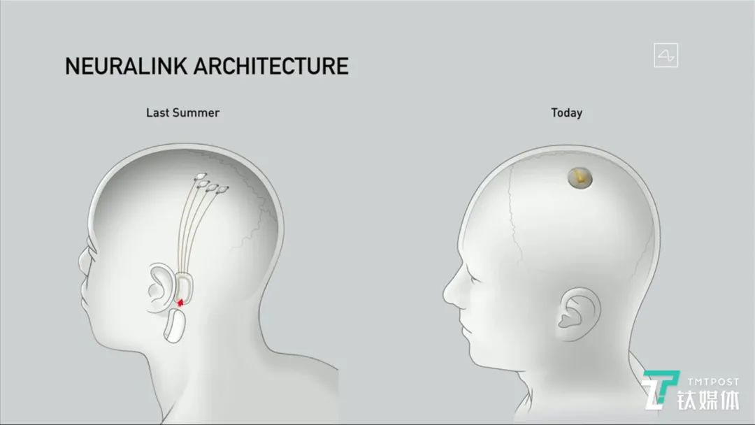 这和去年马斯克发明的“脑后插管”植入N1芯片相比,设备进一步大大简化了:N1芯片需要通过数据线,才能把芯片读取的大脑信号传送出来,所以在耳朵旁边,还挂个设备。