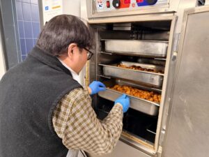 图9: 张文波先生将做好了的甜酸鸡装盘放入保温柜。