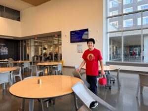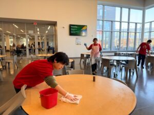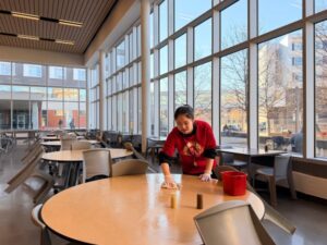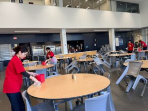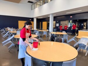 图41: 方汉儒同学在整理和清洁餐厅里的桌椅。