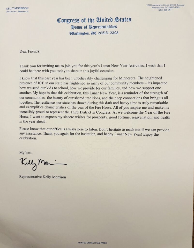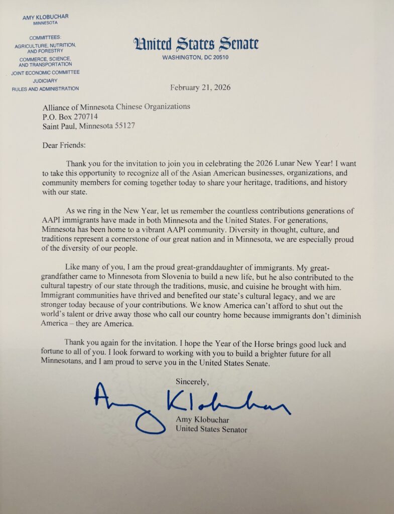 联邦参议员Tina Smith、美国商城中国代理ZJ Tong通过视频送上新春祝福。联邦参议员Amy Klobuchar与联邦众议员Kelly Morrison亦发来贺信,对活动表示祝贺与支持。