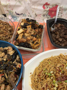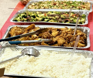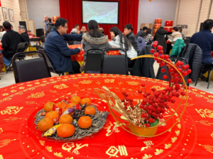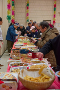 聚餐环节延续了同乡会的百乐宴传统。乡亲们带来各自的拿手湘菜,包括火焙鱼、红烧排骨、腊味拼盘、凉拌米面等,菜品丰富,香气四溢。组委会还准备了年糕、甜酒汤圆、水果与饮品,使餐桌更加丰盛。
