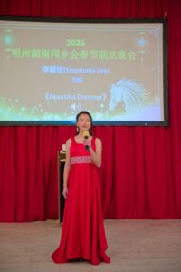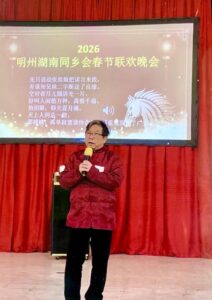 晚会由会长兼本晚活动主持人王平致辞拉开序幕。他回顾了自己 2005 年首次参加同乡会的情景,感慨二十一年来湖南人在明州不断壮大的历程。他表示,在瞬息万变的时代里,“见湘人、说湘话、听湘音、品湘菜、道湘情” 已成为湖南人在海外的精神依托,而那一口改不了的湘音,更是湖南人遍布天下的“认亲密码”。现场掌声热烈,乡亲们深受触动。